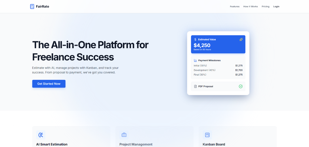 A plataforma completa para o sucesso freelance. Estime com IA, gerencie projetos com Kanban, e acompanhe seu sucesso.