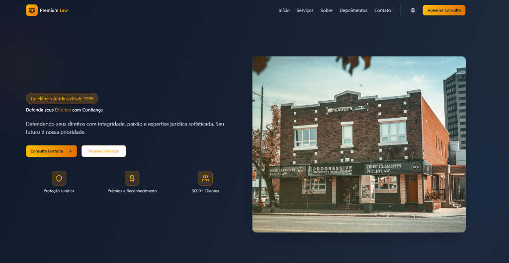 Template de landing page sofisticado e em tema escuro para escritórios de advocacia. Apresenta detalhes em dourado e design de alta confiança.